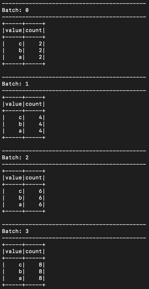 complete mode 로 하기 때문에 spark streaming 으로 들어가는 모든 데이터들이 기억되어지고 갱신된다.