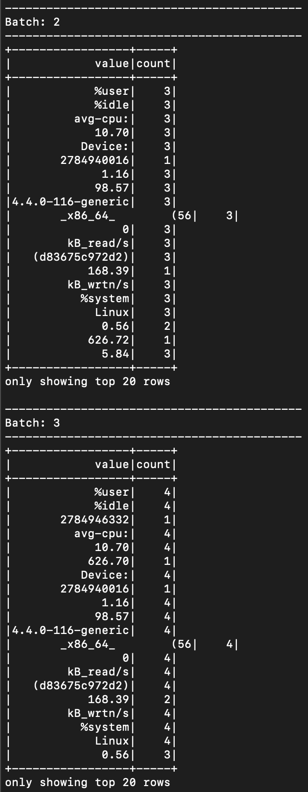 import org.apache.spark.sql.streaming.Trigger spark.conf.set("spark.sql.shuffle.partitions", 1) val str = spark.readStream.option("maxFilesPerTrigger", [1 혹은 2] ).textFile("/streaming") val words = str.as[String].flatMap(_.split(" ")) val wordcounts = words.groupBy("value").count() val query = wordcounts.writeStream.trigger(Trigger.ProcessingTime("10 seconds")).outputMode("complete").format("console").start().awaitTermination() |