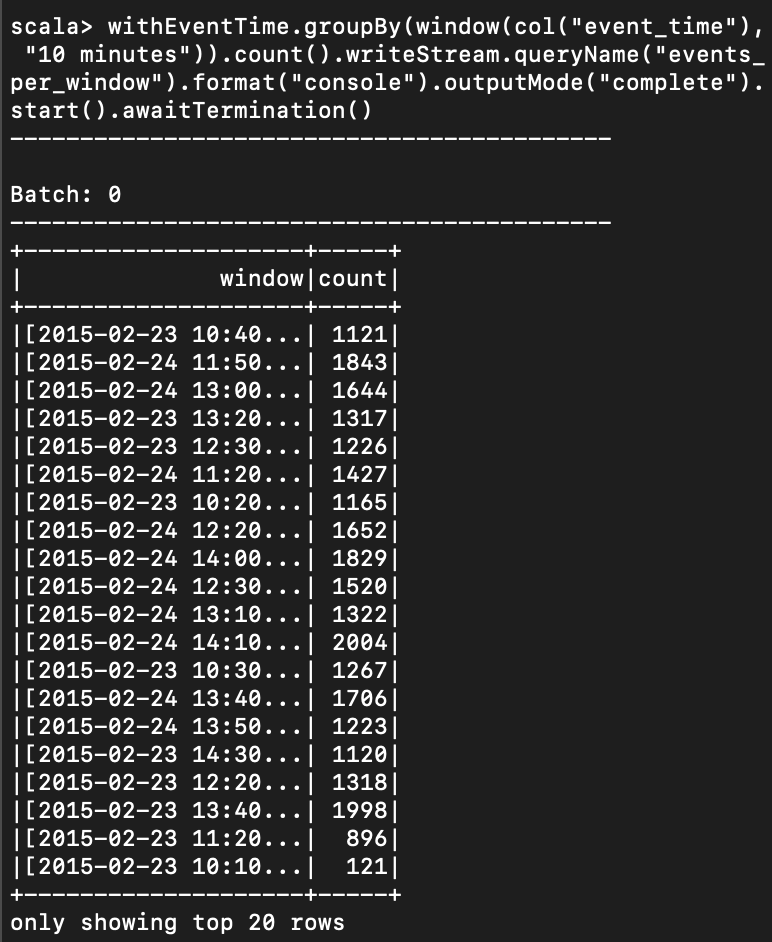 //예제 하나 withEventTime.groupBy(window(col("event_time"), "10 minutes")).count().writeStream.queryName("events_per_window").format("console").outputMode("complete").start().awaitTermination()